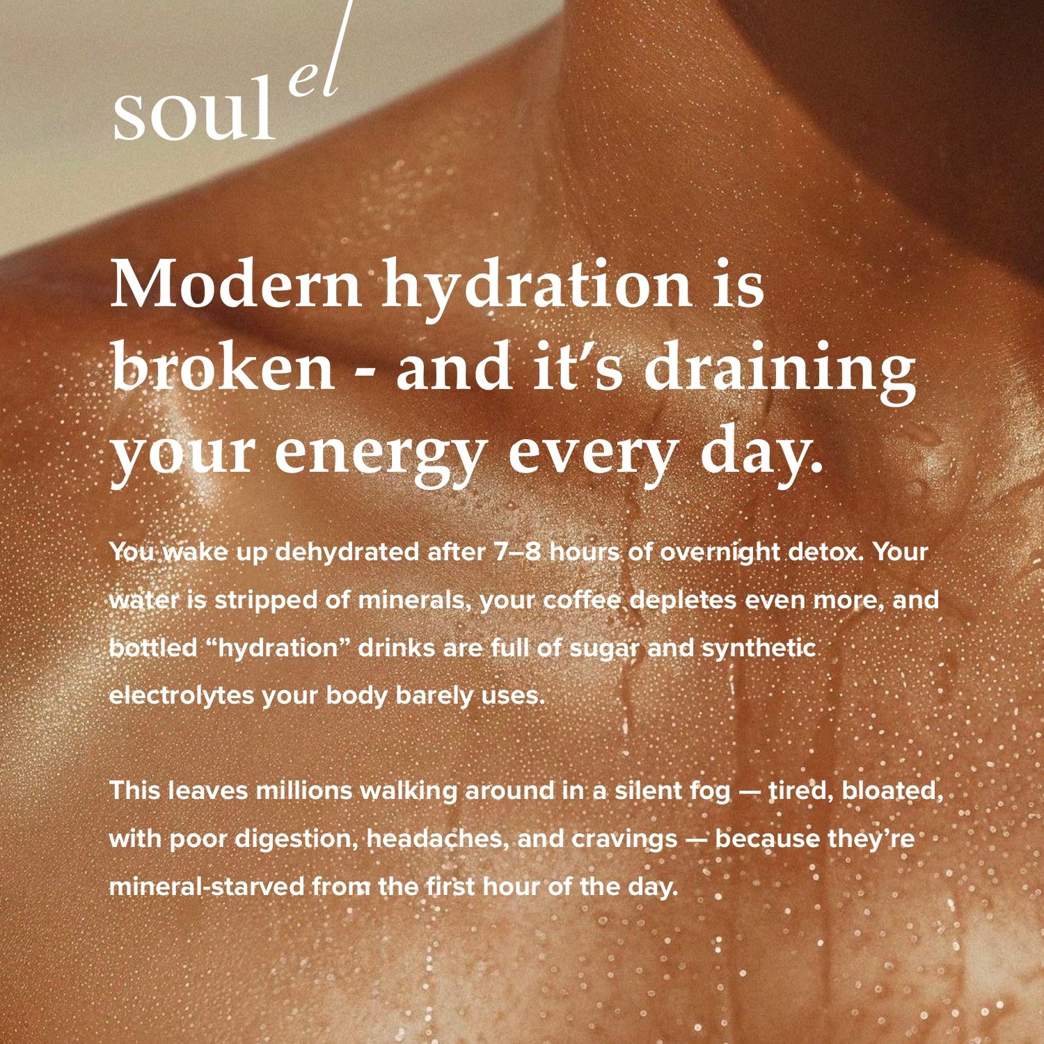 After 7–8 hours of nightly detox, you wake up depleted of minerals. Water without minerals, coffee depletes even more, and bottled “hydration” drinks are just sugar and synthetic electrolytes your body barely absorbs.